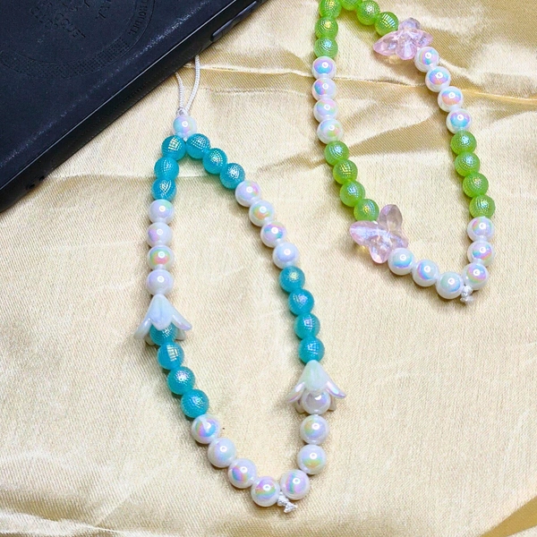 A combo pack featuring two premium beaded phone charms—one with green and white beads adorned with a delicate butterfly charm, and another with blue and white beads featuring an elegant flower charm. Lightweight, durable, and trendy, these accessories double as wrist straps while enhancing your smartphone's look. Perfect as a thoughtful gift or a chic addition to your phone!