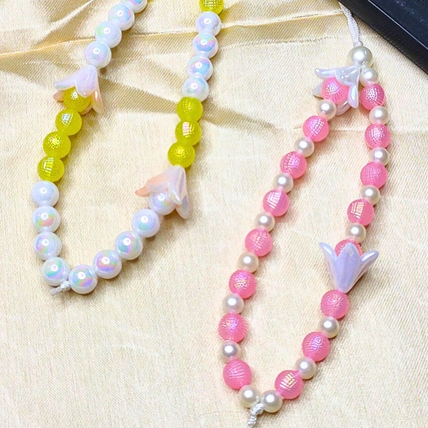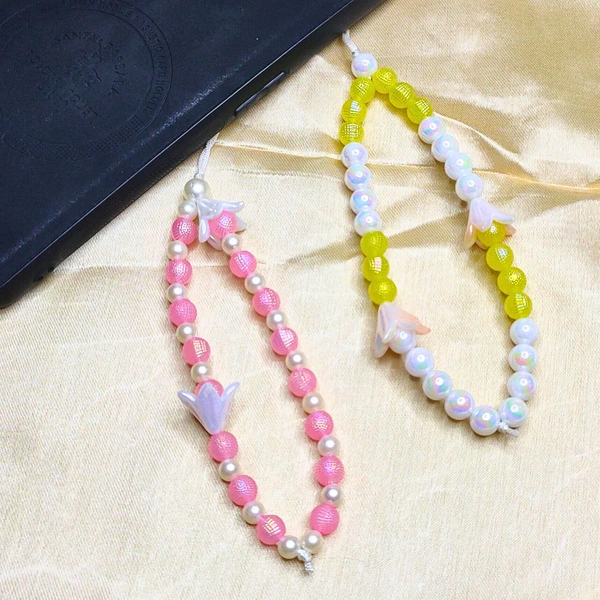 A combo pack featuring two premium beaded phone charms—one with pink and white beads adorned with an elegant flower charm, and another with yellow and white beads featuring a matching flower charm. Lightweight, durable, and trendy, these accessories double as wrist straps while enhancing your smartphone's look. Perfect as a thoughtful gift or a chic addition to your phone!