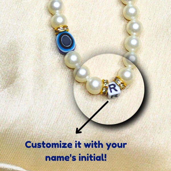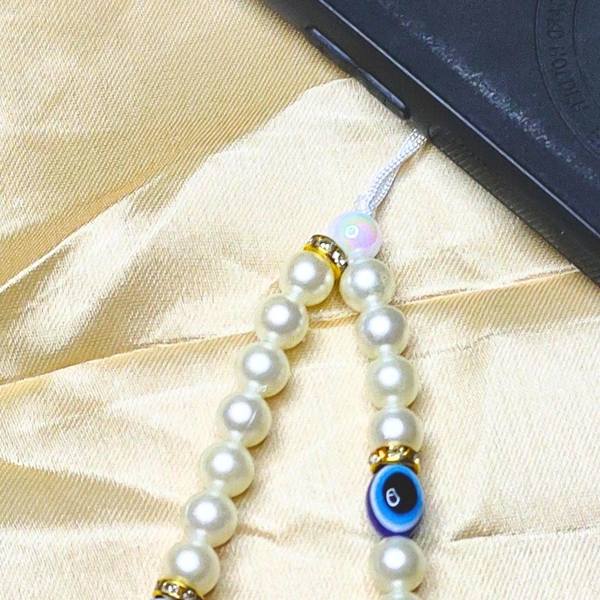 Enhance your smartphone with this elegant handmade phone charm, featuring premium cream and golden beads, evil eye charms for protection, and personalized letter charms. Designed for style and durability, this lightweight accessory is the perfect combination of functionality and charm. A thoughtful gift or a unique way to personalize your device!