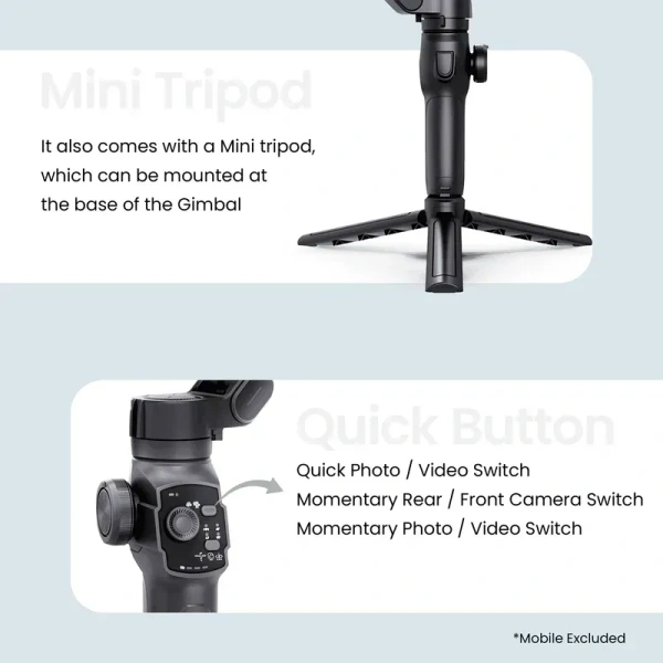 - 3-Axis Stabilization: Achieve smooth and stable video recording with tilt, roll, and pan angles of 160°, 325°, and 340°, respectively.