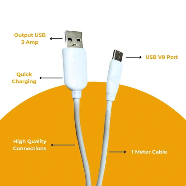 KPS 3 Amp 1m Micro USB Data Cable for Smartphones, Tablets & Other V8 Devices, Quick Charge & Sync, KP-413, White