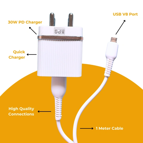 KPS 30W PD Micro USB Travel Charger with Quick Charge 3.0, Dual USB Ports - USB & Type C, Fast Charging, Overcharge & Overheating Protection, Compatible with USB-Micro USB and PD-Enabled Smartphones and Devices, KP-C202, White