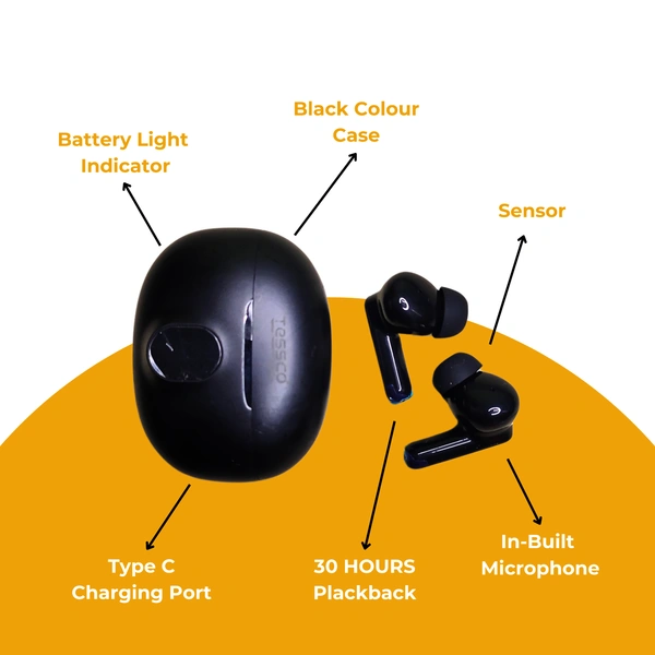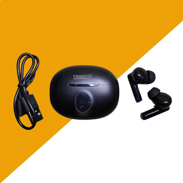 TESSCO IBUD-425 TWS Earbuds, Bluetooth 5.3, 30H Playback, 1000H Standby, 300mAh Battery Case, Low Latency 50ms, Dual Master, 10mm Drivers, Touch Control, Sweat & Water Resistant, FTD Chipset, Black, white