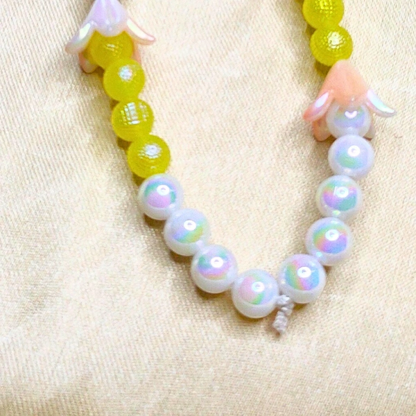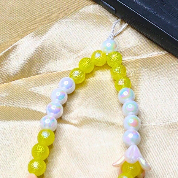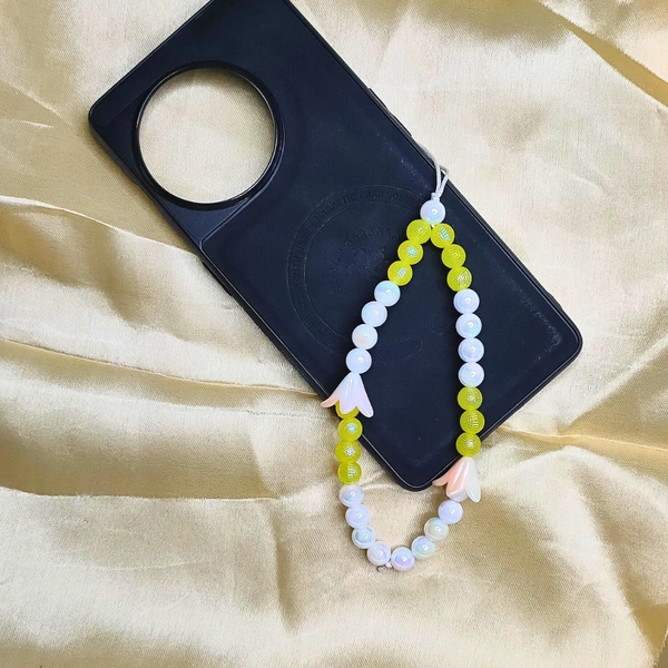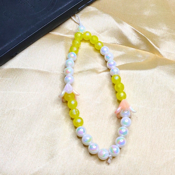 Yellow and white beaded phone charm crafted with premium beads, featuring 2 elegant flower charms for added style and functionality. Lightweight, durable, and trendy, this accessory doubles as a wrist strap while enhancing your smartphone's look. Perfect as a thoughtful gift or a chic addition to your phone!
